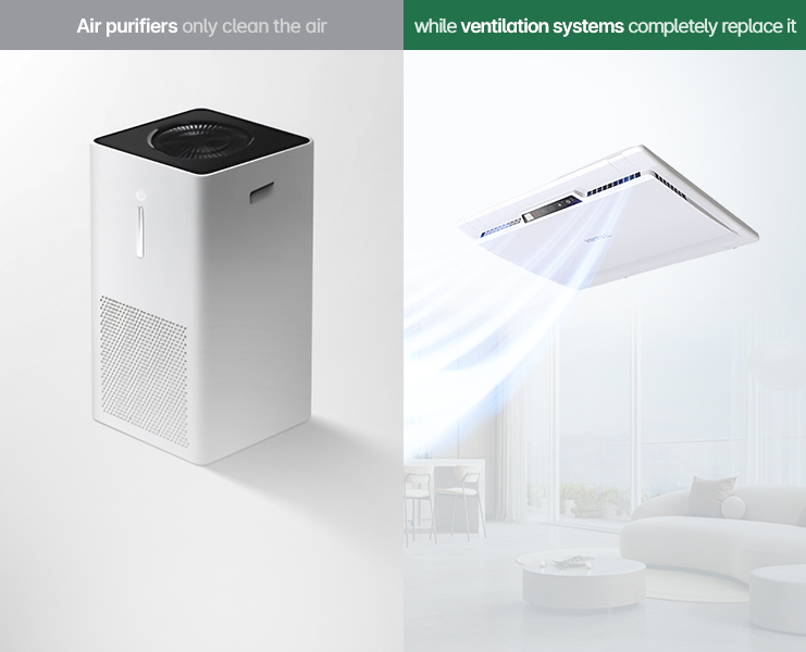 The built-in, ceiling-mounted design provides a clean finish and sophisticated details, saving more space and adding a sleeker interior element compared to air purifiers.