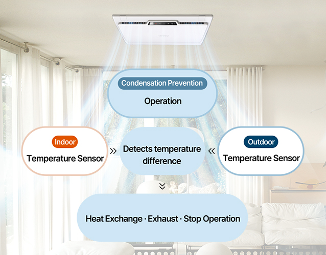 Automatically switches between three operation modes (extreme, intermittent, and winter) based on the indoor/outdoor temperature difference, helping to prevent condensation and maintain comfort.